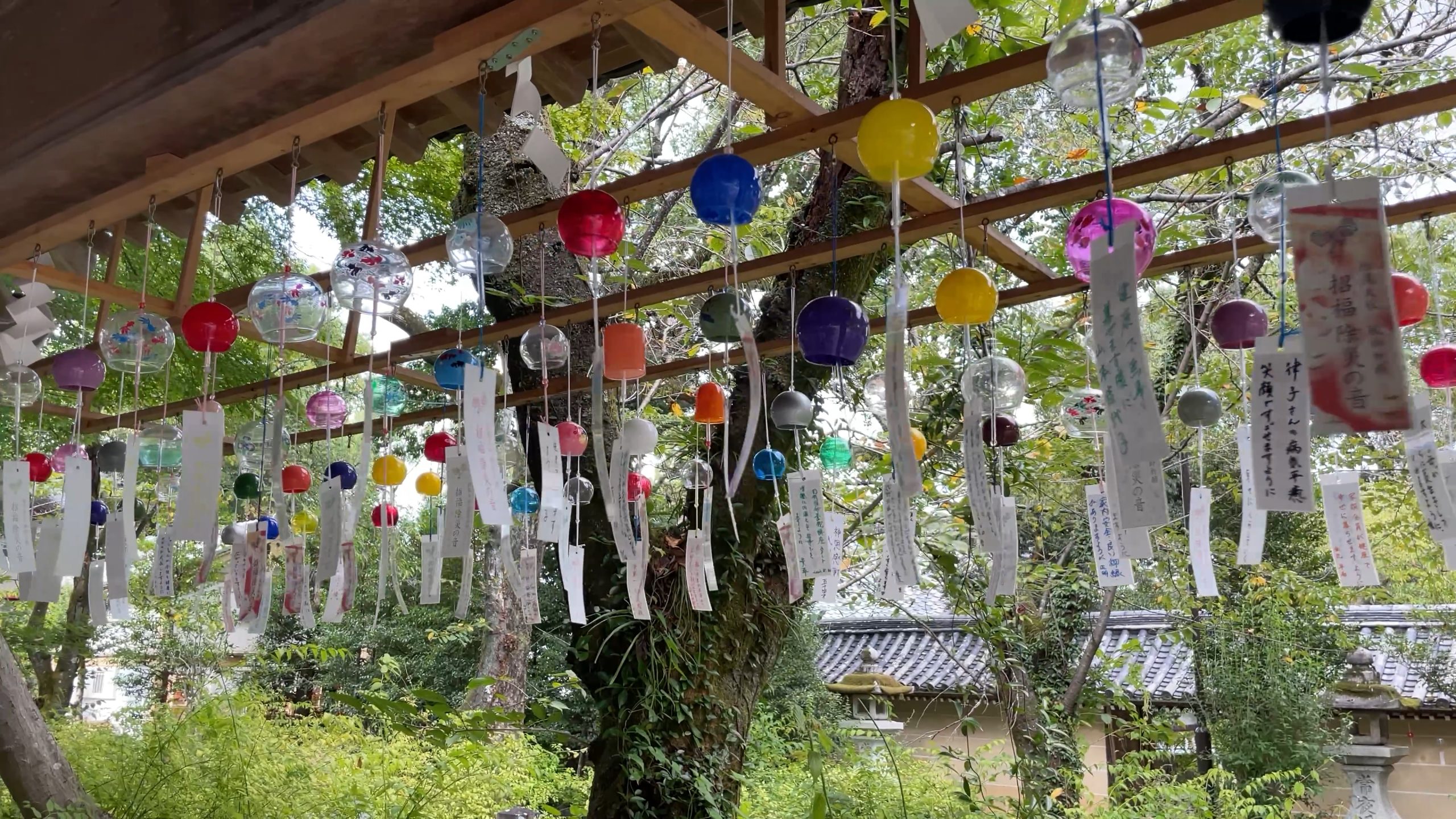 境内の門をくぐると壁や御手水の屋根に沢山の風鈴が吊り下げられていました。